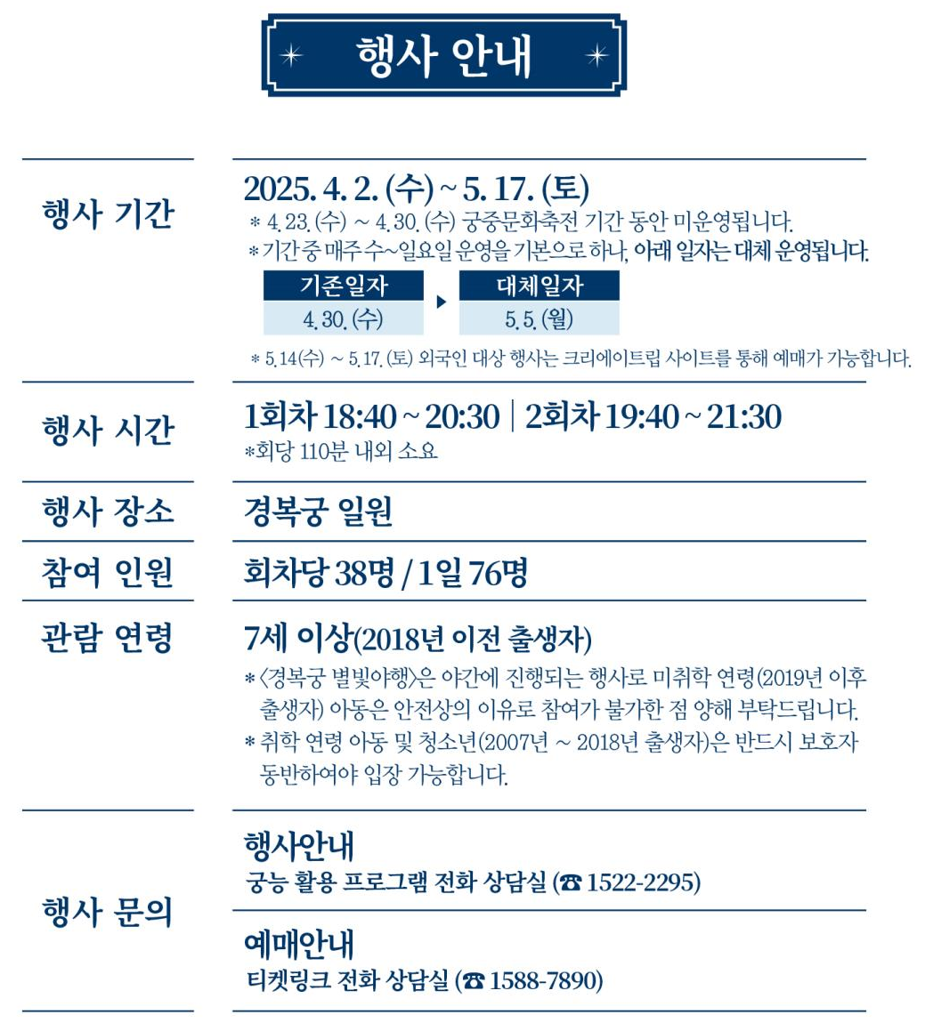 올해부터 경복궁 별빛야행 티켓은 티켓링크에서 전면 추첨제로 진행됩니다. 응모 기간은 3월 13일 오후 2시부터 3월 19일 오후 2시까지입니다. 3월 20일 오후 5시에 당첨자가 발표되고, 당첨자는 3월 21일 오후 2시부터 4일간 최대 2매까지 선예매가 가능합니다. 늘 오픈 동시에 거의 매진됐던 경복궁 별빛야행 이번엔 추첨제로 진행하니 응모 기간 내에 꼭 예약하시길 바랍니다.