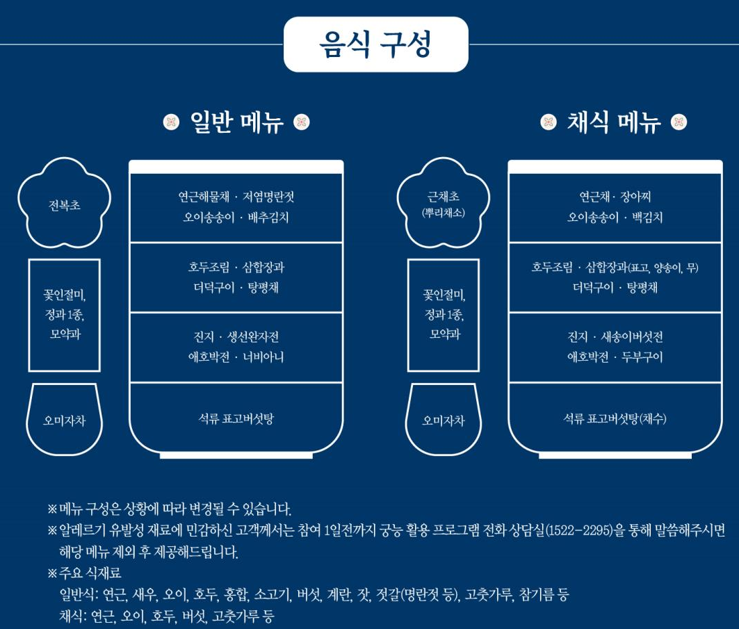 왕과 왕비가 먹었던 궁중 요리를 맛볼 수 있는 특별한 기회! 메뉴는 시기별로 다르지만 정성이 담긴 전통 음식들을 맛볼 수 있습니다.