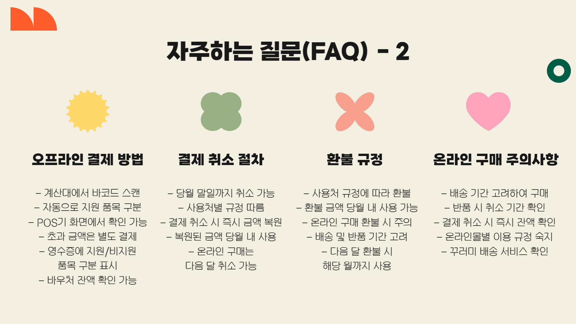 A5. 걱정하지 마세요. 계산할 때 자동으로 구분되어서 계산됩니다. 영수증에도 어떤 물건이 지원 대상인지 표시가 됩니다.