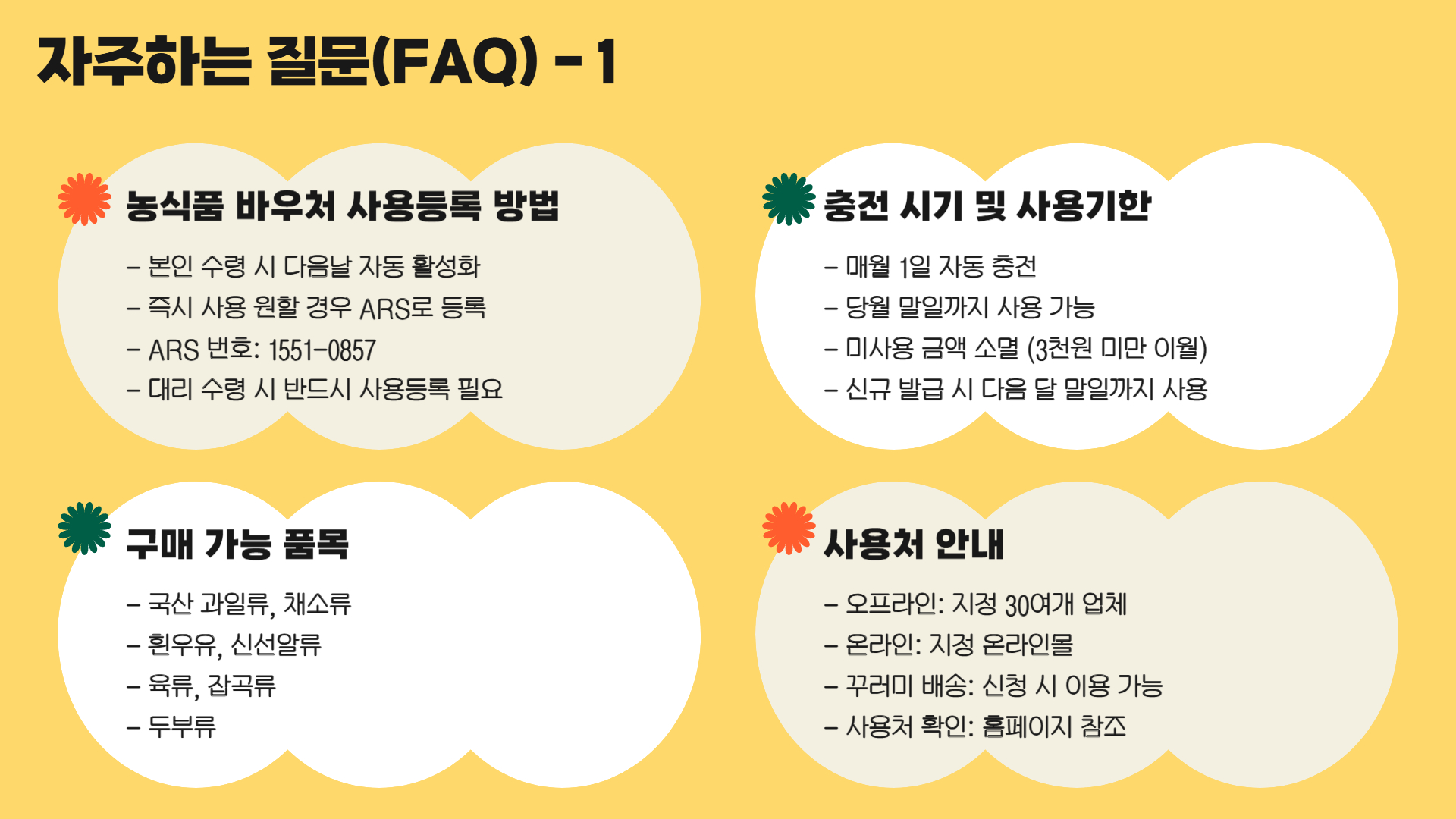 더 자세한 정보나 궁금한 점이 있으시면 문의 사항이 있으시다면 가까운 주민센터에 방문하시거나, 고객지원센터(☎️ 1551-0857)로 연락하시거나, 농식품바우처 공식 홈페이지를 방문해주세요.