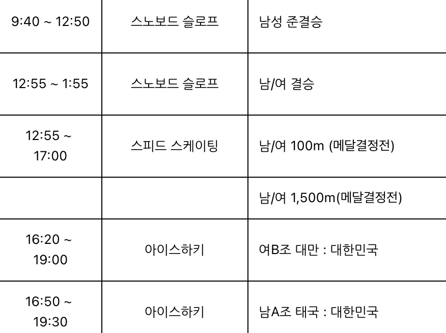 동계 아시안게임 일정(2/8)