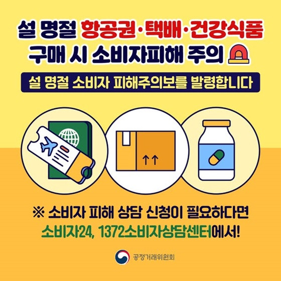 설날 연휴는 즐거운 시간인 만큼, 소비자 피해도 예방해야 하는 시기입니다. 항공권, 택배, 건강식품 구매 시 주의할 점을 알기 쉽게 정리했습니다. 간단한 수칙만 지켜도 피해를 예방할 수 있어요. 😊