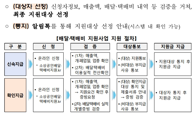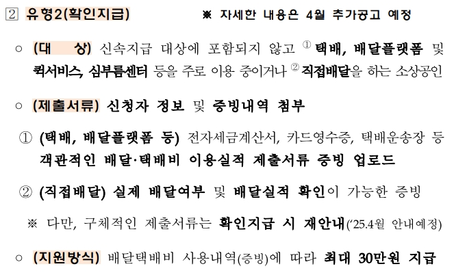 ✅ 직접 배달하시는 분들: 배달 플랫폼이나 택배사를 이용하지 않고 직접 배달하시는 소상공인 분들은 증빙 자료 제출이 어려울 수 있습니다. 이 경우, 관련 협·단체의 의견을 반영하여 합리적인 지급 방안을 마련할 예정이니 추후 공지를 확인해주세요.