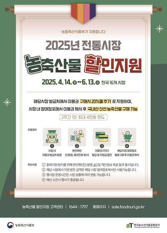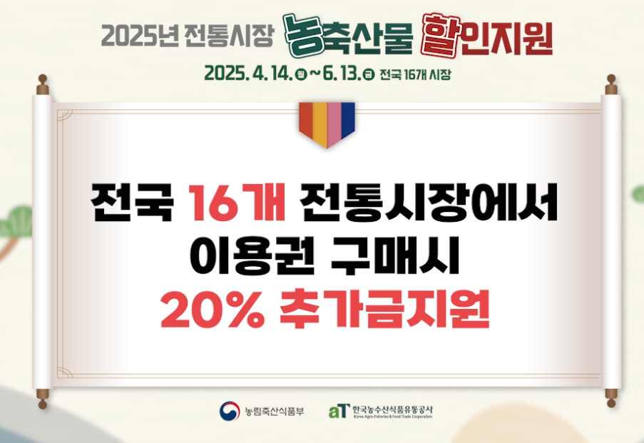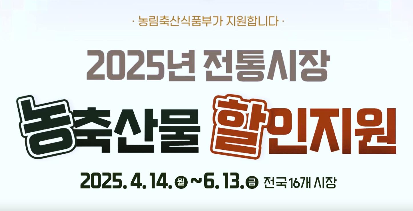 2025년 4월 14일부터 6월 13일까지, 전국 16개 전통시장에서 농축산물 할인지원 시범사업을 시행하거든요.