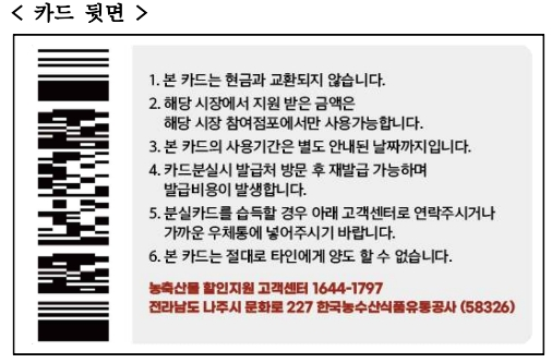 할인 방식 | 전용 카드(이용권) 발급 받아 지원금 충전해 해당시장 참여점포에서 결제하면 충전 금액 20% 추가 지원 |