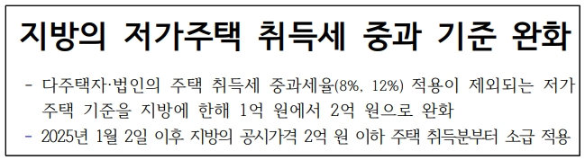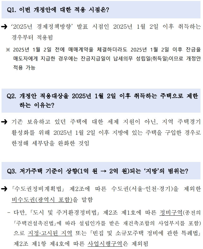 이번 개정안은 2025년 1월 2일 이후 지방에 소재한 공시가격 2억원 이하의 주택을 유상으로 취득하는 경우부터 적용됩니다.