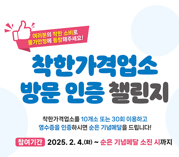 - 주변에서 착한가격업소를 찾아 10곳 이상 방문하거나 총 30회 이용하세요.