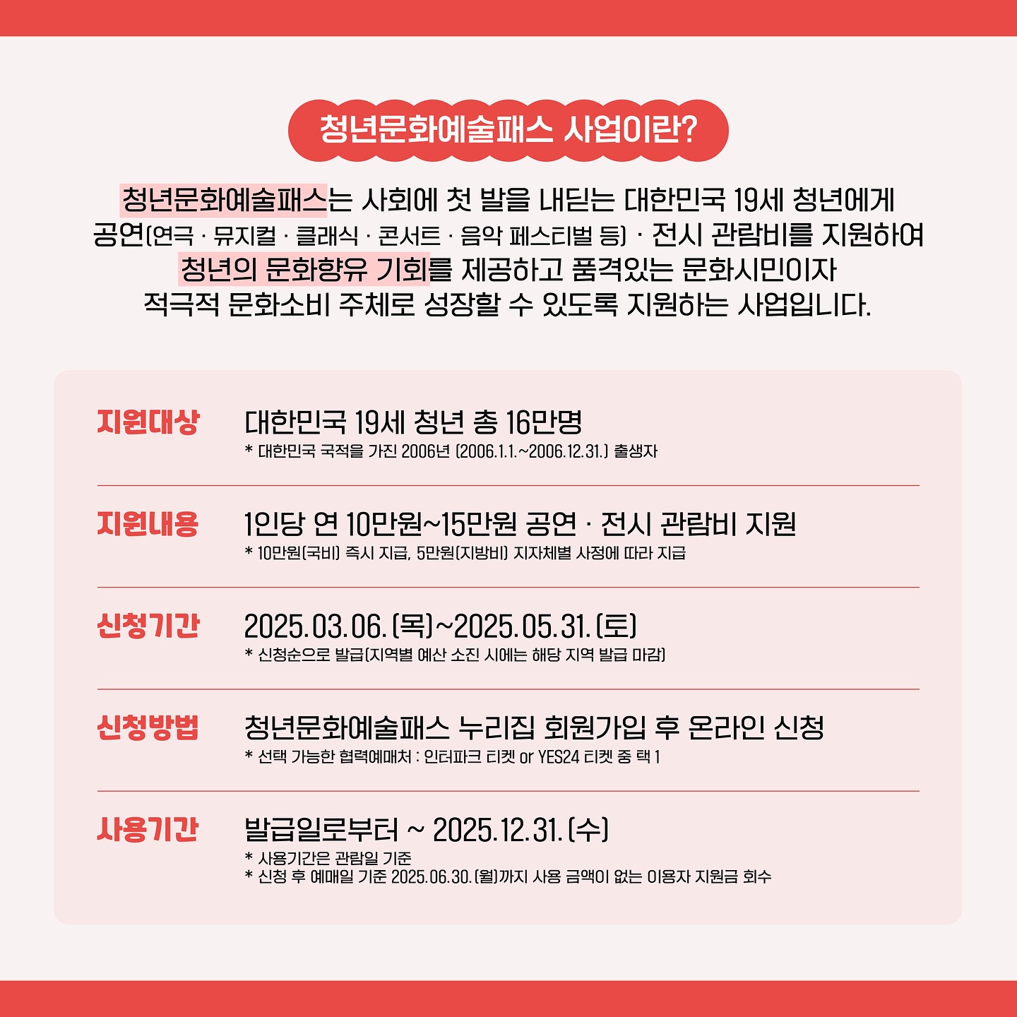 🎉 2006년생이라면 청년 문화예술패스 신청하세요! 뮤지컬, 콘서트, 클래식 공연부터 전시까지 최대 15만원 혜택을 받을 수 있는 절호의 기회!!