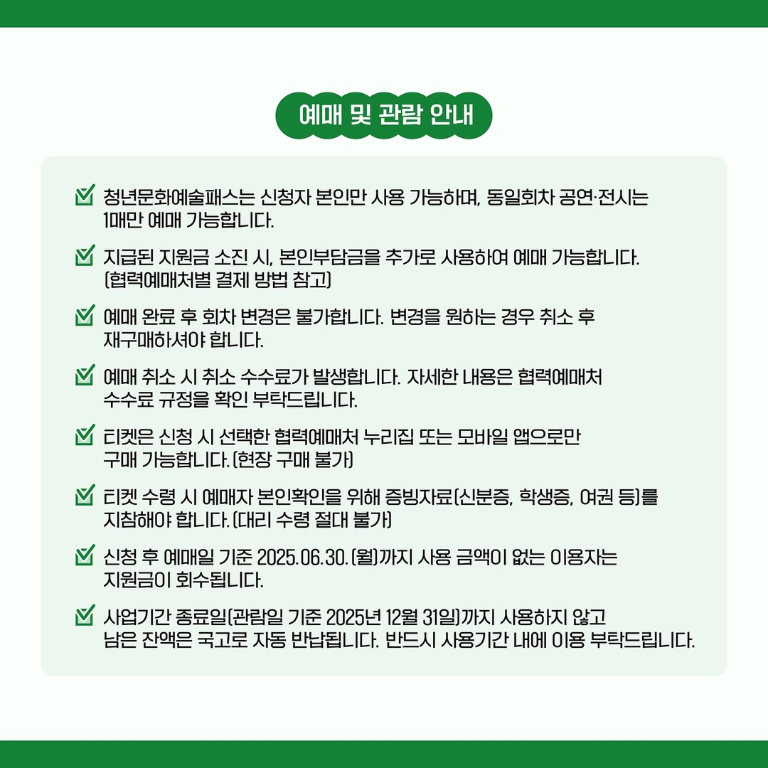 ✔️ 청년문화예술패스 누리집: 마이페이지에서 예매일 기준 1일전 사용내역 확인 가능