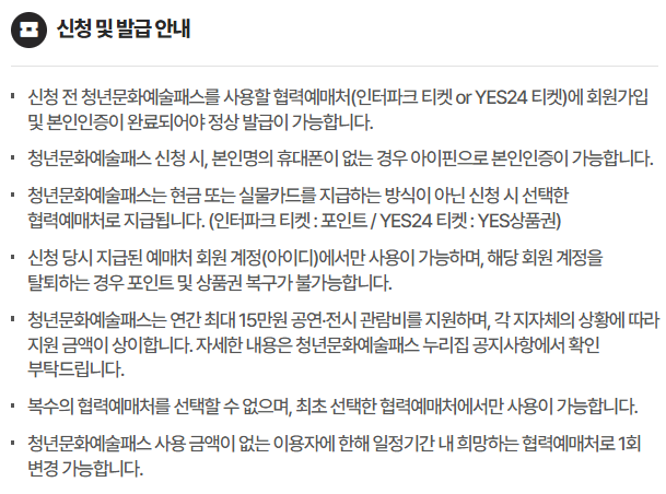 청년 문화예술패스 신청 이후 본인이 선택한 협력예매처에만 사용 가능