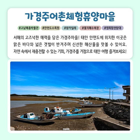 안녕하세요. 추운 겨울, 따뜻한 마음을 채워줄 특별한 여행지를 찾고 계신가요? 오늘은 서해안의 숨은 보석 같은 곳, 충남 태안의 가경주마을을 소개해드릴게요. 맑은 공기, 탁 트인 바다, 맛있는 해산물까지!! 완벽한 힐링 여행지랍니다. 😊