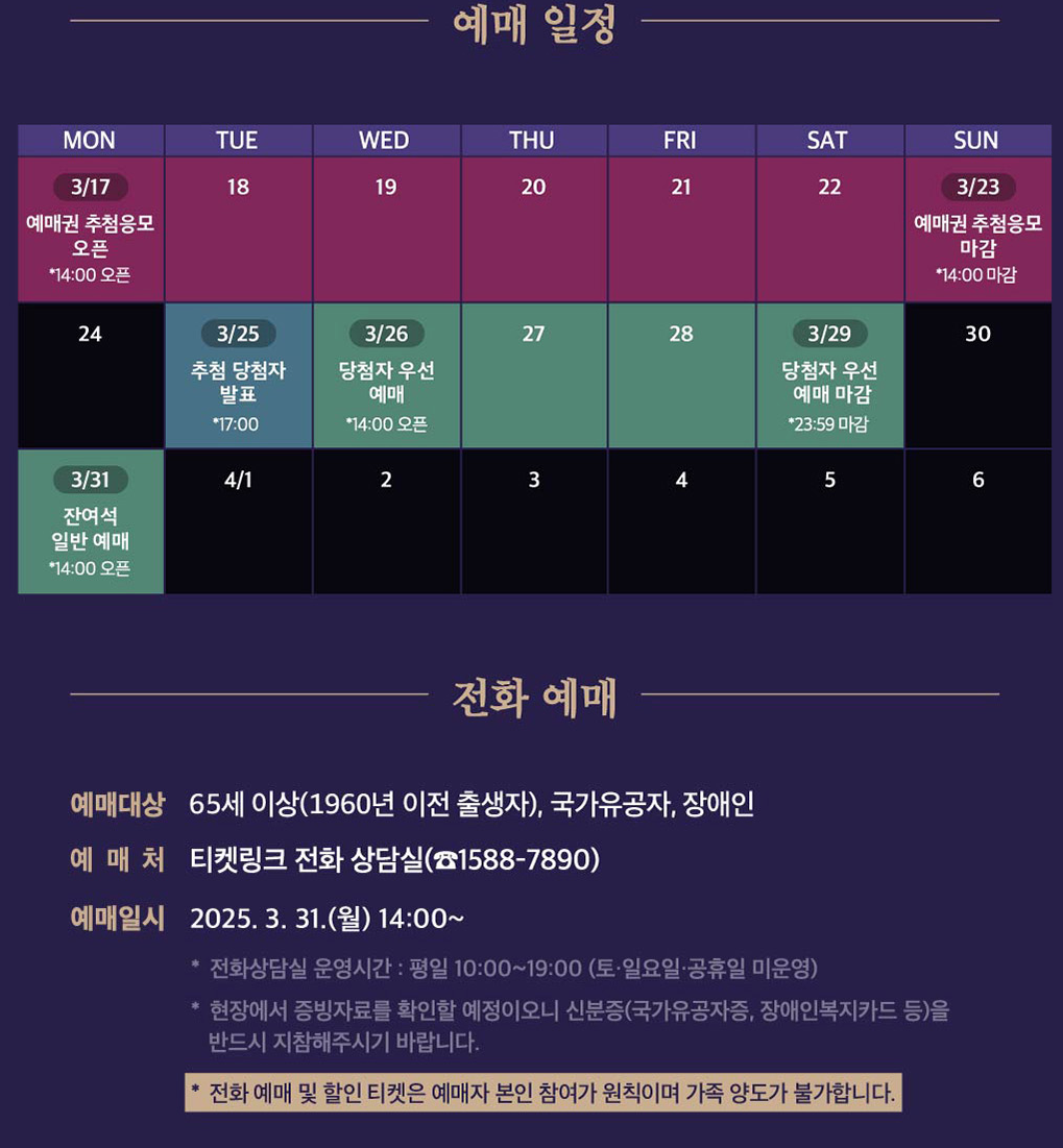 📞 전화 예매 (65세 이상, 장애인, 국가유공자 대상): 3월 31일(월) 14:00부터