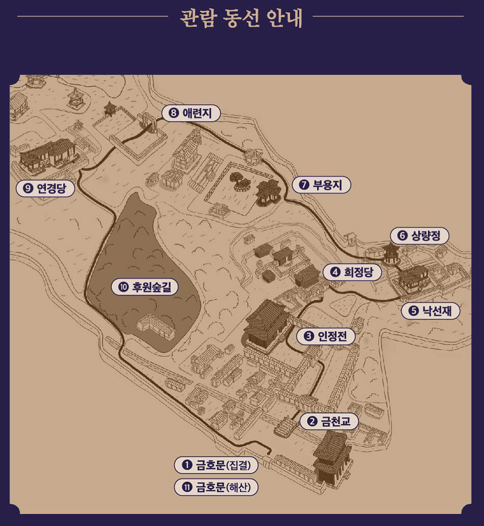 금호문 → 금천교 → 인정전 → 희정당 → 낙선재 → 상량정 → 부용지 → 애련정과 애련지 → 연경당 → 후원 숲길 → 금호문