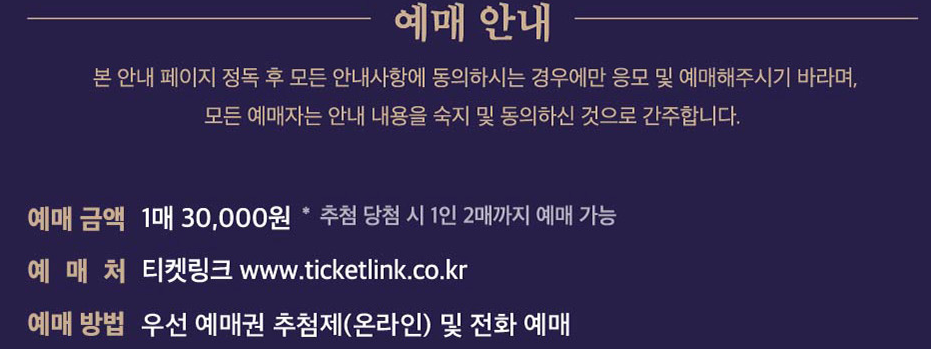 🔹 온라인: 티켓링크에서 사전 응모 후 당첨자에 한해 예매 (1인당 2매)