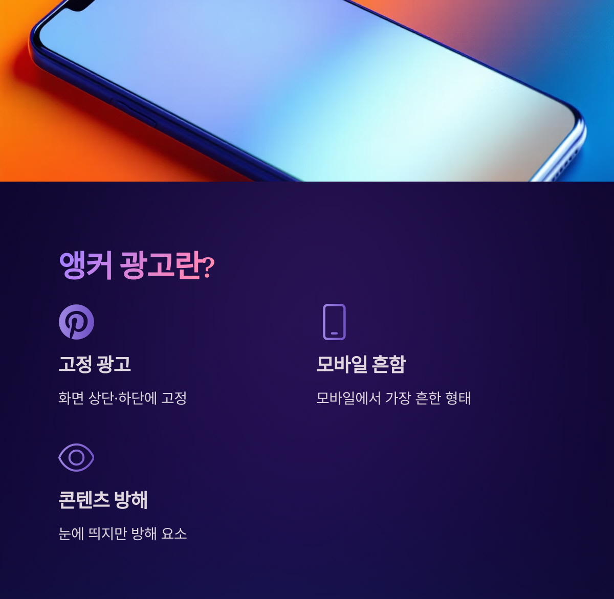 ✔ 앵커 광고(Anchor Ads): 화면 상단 또는 하단에 고정되어 스크롤해도 따라다니는 광고