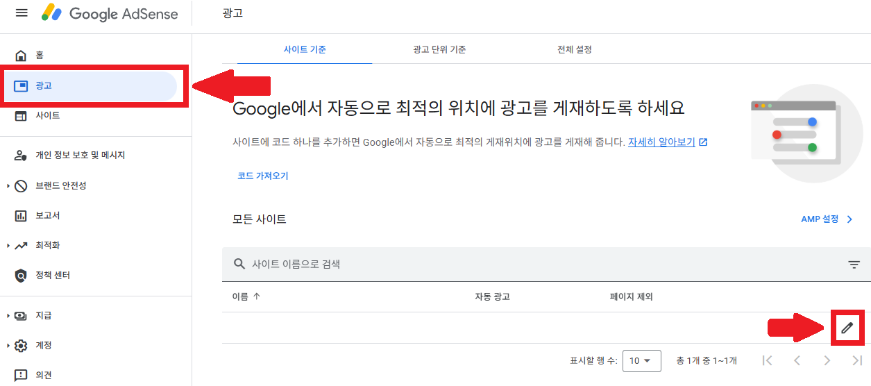 Google 계정으로 로그인 후, 왼쪽 메뉴에서 [광고] → [사이트] 항목 클릭