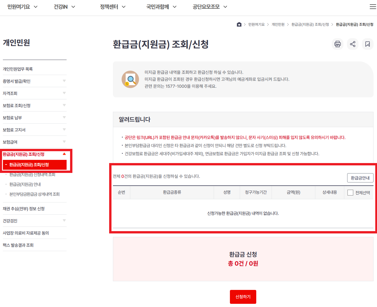 - 조회하는 분이 피부양자(세대원)인 경우 본인의 환급금 내역조회와 지급신청만 가능합니다.