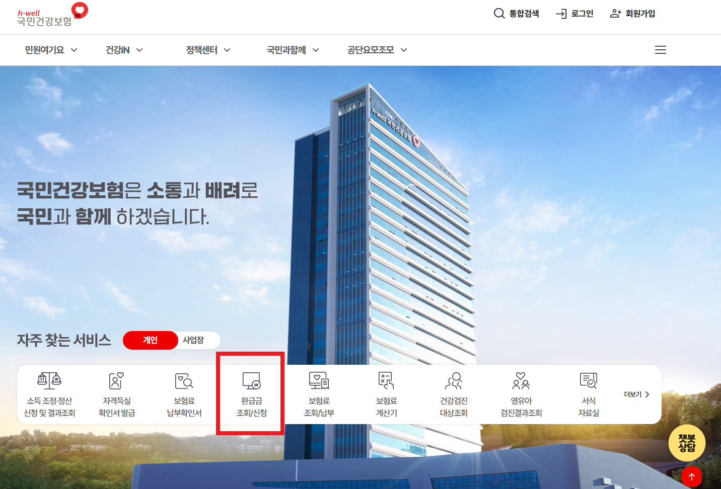 - 조회하는 분이 가입자인 경우 본인은 물론 현재 동일 건강보험증에 등재되어 있는 피부양자(세대원)의 환급금 내역조회와 지급신청이 가능합니다.