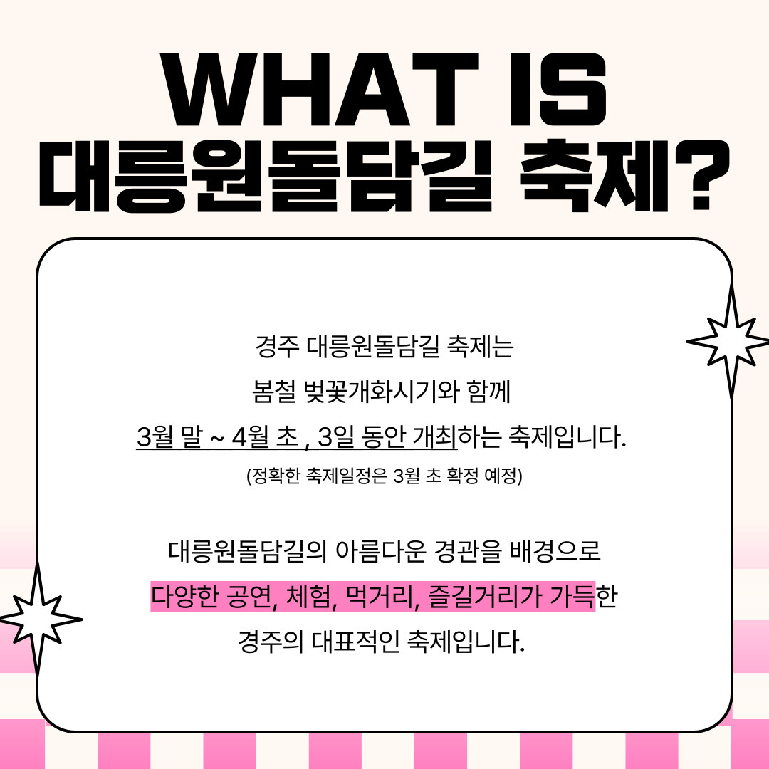 - 특징: 역사와 문화가 어우러진 경주에서도 매년 벚꽃축제가 열리는데요, 대릉원돌담길, 보문관광단지, 흥무공원 등에서 다양한 행사가 진행됩니다. 특히 보문호수를 따라 펼쳐진 벚꽃길은 산책과 드라이브 코스, 사진 촬영 명소로 유명합니다. 역사적인 유적지와 벚꽃의 조화로운 풍경을 감상할 수 있습니다.