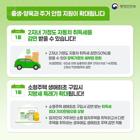 - 취득세 면제 금액이 최대 300만 원으로 확대됩니다.