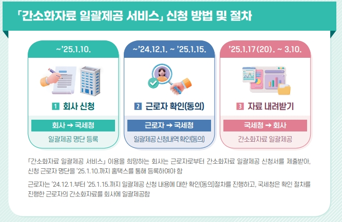 - 사업자: 간소화자료 일괄제공 서비스 이용을 희망하는 회사는 근로자로부터 간소화 자료 일괄 제공 신청서를 제출받아 신청 근로자 명단을 2025년 1월 10일까지 홈택스를 통해 등록해야 합니다.