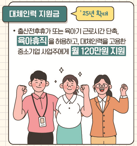 ▲ 사업주가 육아휴직에 들어가는 근로자를 대체할 인력을 채용할 경우, 지원금이 기존 월 100만원에서 120만원으로 인상됩니다.
