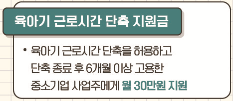 ▲ 육아기 근로시간 단축을 허용하고 단축 종료 후 6개월 이상 고용한 중소기업 사업주에게 월 30만원을 지원합니다.
