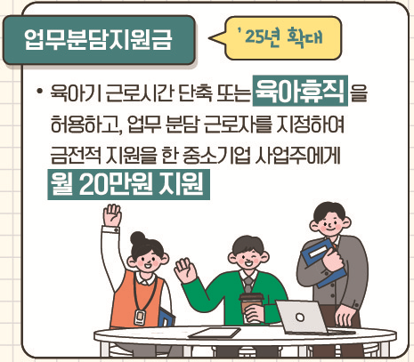 ▲ 육아기 근로시간 단축 또는 육아휴직을 허용하고 업무분담 근로자를 지정하여 금전적 지원을 한 중소기업 사업주에게 월 20만원을 지원합니다.