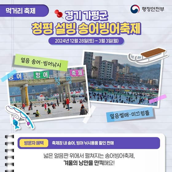 - 장소: 경기도 가평군 청평면 강변로 17 청평 강변로 설빙송어빙어축제장