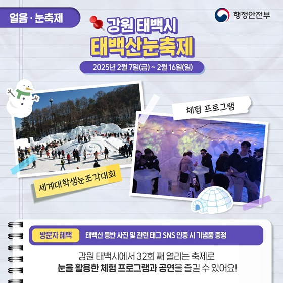 - 32년 전통의 태백산 눈축제로, 겨울왕국 같은 풍경을 만끽해 보세요.