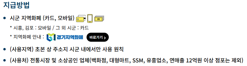 경기도 내 등록된 지역화폐 가맹점에서 사용 가능합니다. 프랜차이즈 일부 매장, 대형마트 등은 제외될 수 있으니 확인이 필요해요.