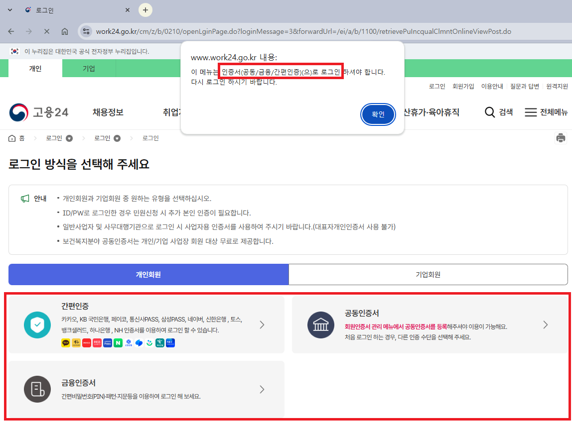2. 공동인증서, 금융인증서, 간편인증 중 하나로 로그인
