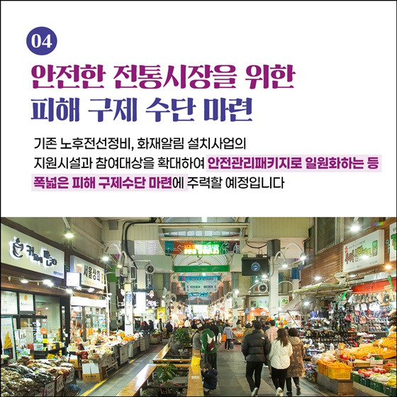 노후 전선 정비와 화재 알림 설치사업을 확대하여 전통시장의 안전성을 강화합니다.