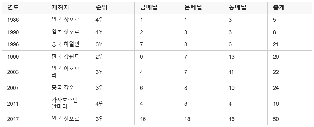 역대 동계 아시안게임에서 대한민국의 성적입니다. 1999년 강원도 대회에서 2위를 기록하며 좋은 성적을 거두었습니다. 개최국의 힘일까요~?