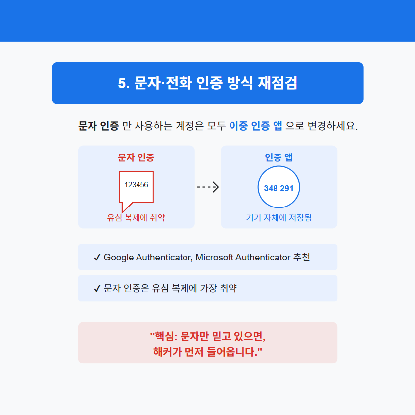"핵심: 문자만 믿고 있으면, 해커가 먼저 들어옵니다."