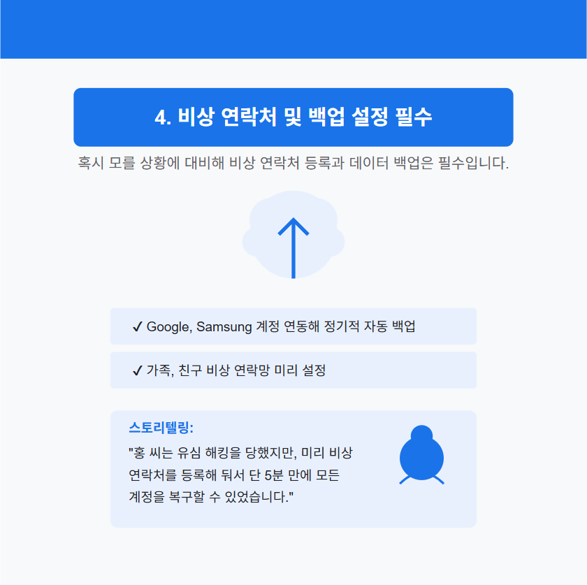 혹시 모를 상황에 대비해 비상 연락처 등록과 데이터 백업은 필수입니다.
